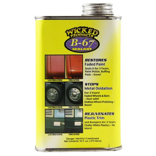 Metal oxidation. If you have a polished metal piece, B-67 Sealant can be applied to it, and under standard conditions, it will last for 3 years. No need for repolishing. Ideal for bullbars, fittings, wheels or any polished metal surface. Can easily be removed at any time with Wicked Metal Polish.