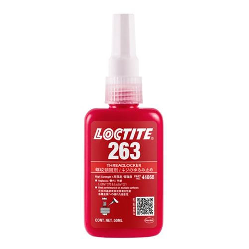 LOCTITE® 263 is a red, dual cure, acrylic dimethacrylate ester fluorescent threadlocker designed for the permanent locking and sealing of threaded fasteners. It cures between close fitting metal surfaces and prevents loosening and leakage from shock and vibration. It works on active metals (e.g. brass, copper) and passive substrates such as stainless steel and plated surfaces.