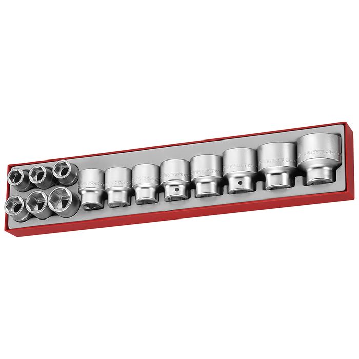 14 piece set containing 6 point metric sockets made from chrome vanadium steel. The set is supplied in a unique Teng Tools drawer width TTX tray and can be used either on it's own or as part of the Teng Tools TC control system. The tray features a removable hinged click lock lid and dove tail joints which enable different trays to be locked together and used as trays in Teng Tools tool boxes and roller cabinets. All of the tools in the set have their own individual place so lost tools can easily be identified.